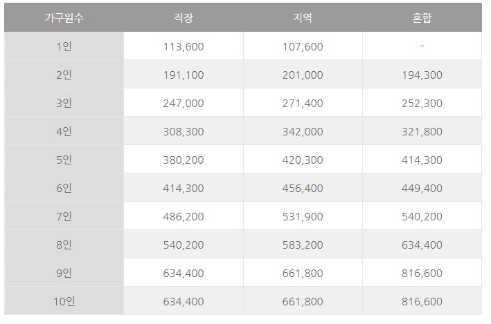 선정 기준표를 살펴보면 가구별 건강보험료 합산액이 아래