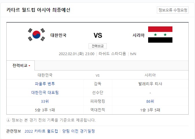 한국과 시리아는 2022년 카타르 월드컵 본성행 확정을 위해서