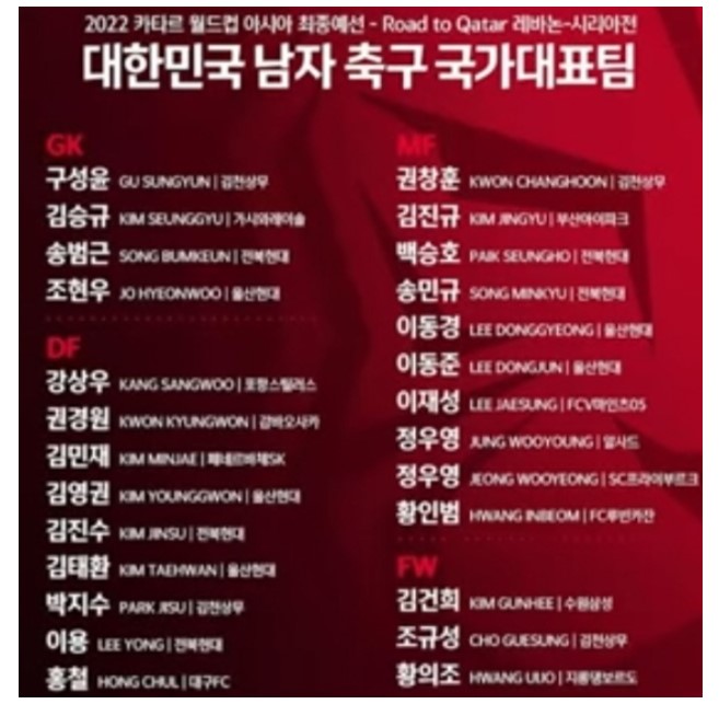 다만 아쉬운점은 현재 대표팀에 손흥민과 황희찬 선수가 출장이 어렵다는점 입니다.